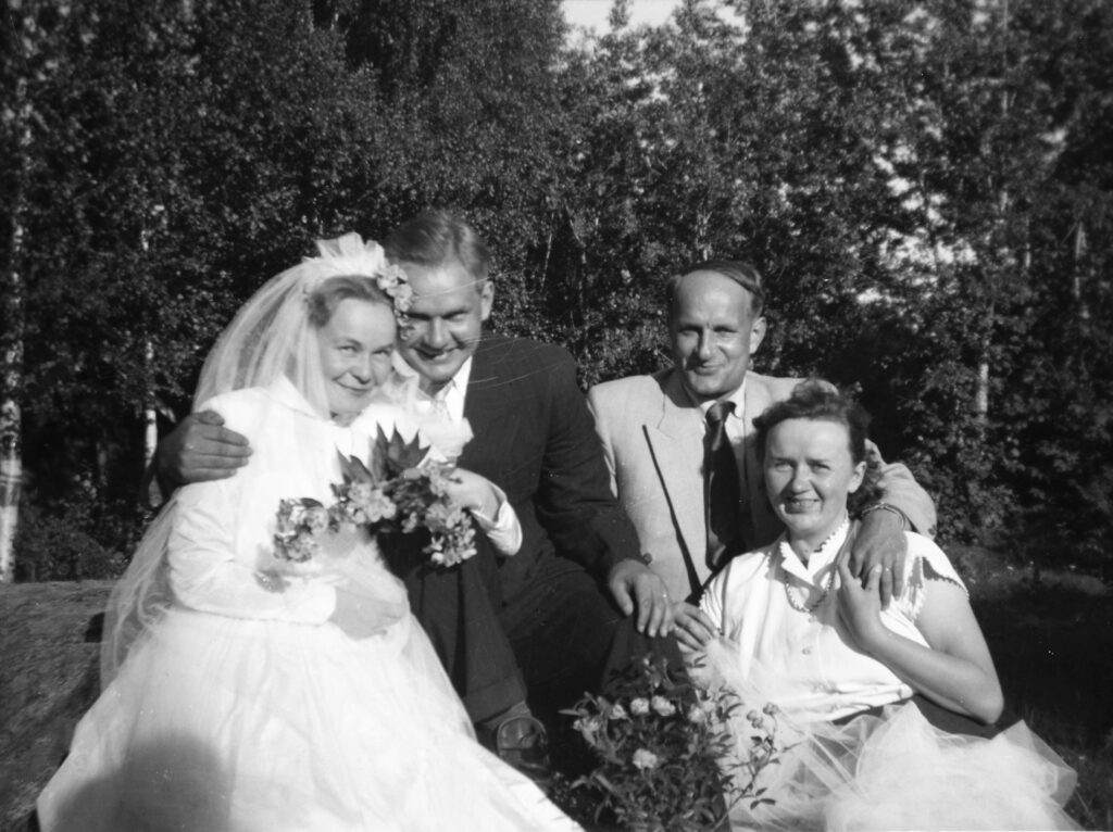 Ryhmäkuvassa tuore pariskunta poseeraa tuonnempana häiden jälkeen isä-Keijon veljen, Taiston ja tämän Kirsti-vaimon kanssa Hauholla, Hyömäen Limoniemessä.