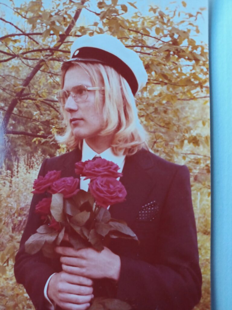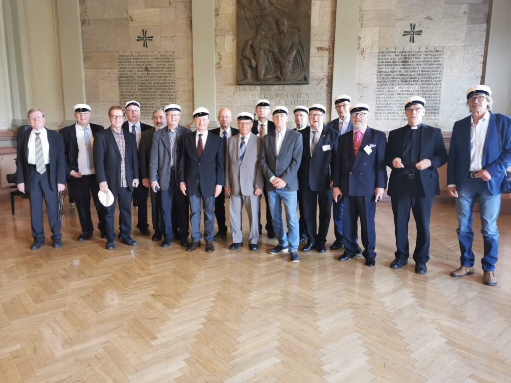 Ja vielä kaksi kuvaa. Ylempi on vuodelta 2022, jolloin meillä Joensuun lyseon pojilla oli riemuylioppilaiden juhla eli silloin, kun lakituksesta oli kulunut tasan 50 vuotta. Tässä koko porukka vanhan lyseon juhlasalissa. Tuo silloinen lyseorakennus on nykyisin Joensuu taidemuseo.